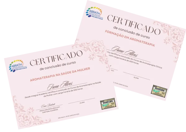 Imagine-se como um Aromaterapeuta Profissional Certificado, transformando vidas com o melhor da Natureza e encontrando satisfação em uma carreira que não só preenche seu coração como também oferece excelente remuneração. Nosso curso te guiará em cada passo até que esteja pronto para realizar atendimentos como um Aromaterapeuta Clínica. Além disso, ao concluir a formação você receberá um 2 CERTIFICADOS VALIDADOS E REGISTRADOS, garantindo seu reconhecimento profissional, permitindo que você atue, diagnostique e INDIQUE os óleos essenciais em qualquer lugar, enriquecendo sua carreira e vida financeira.